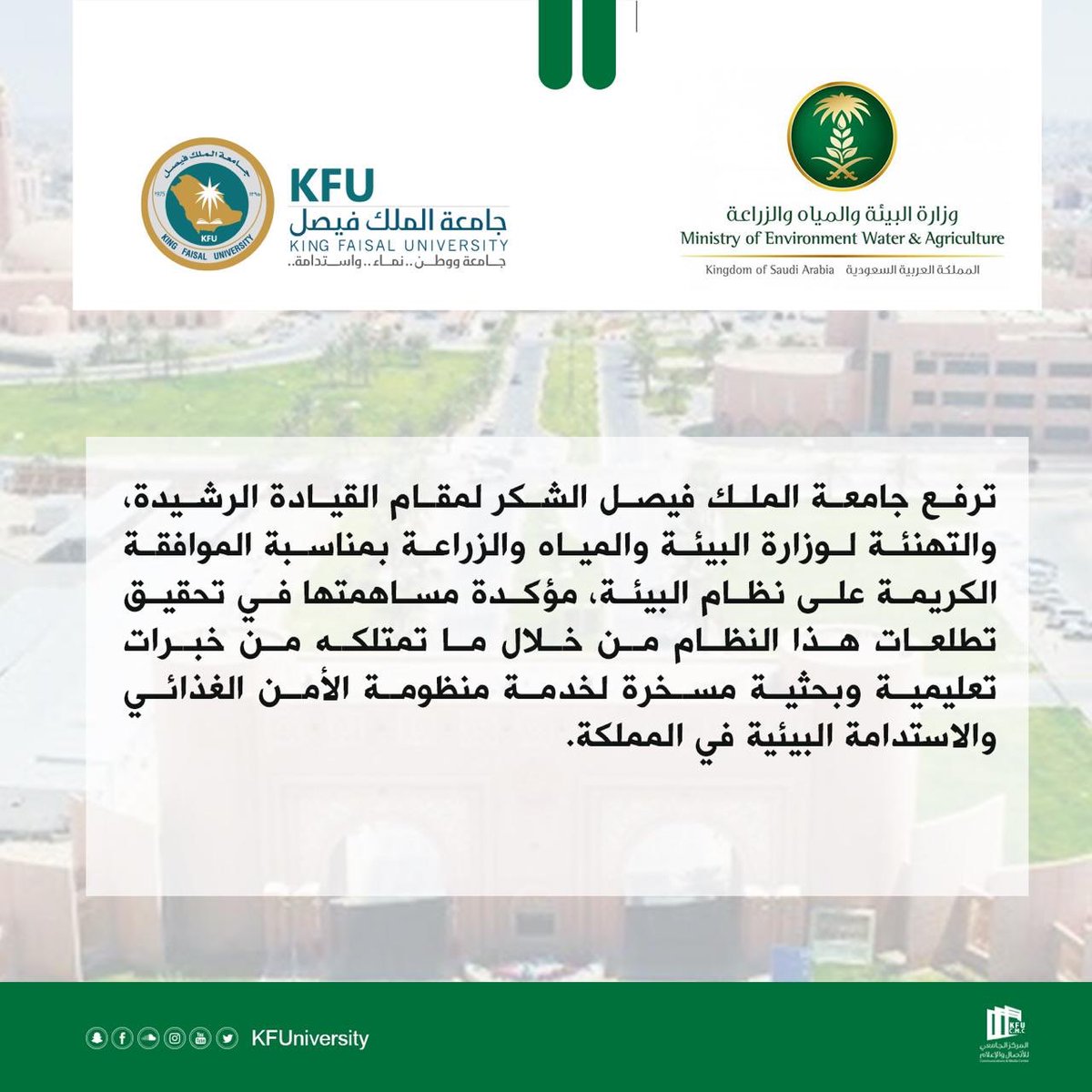 جامعة الملك فيصل On Twitter ترفع جامعة الملك فيصل الشكر لمقام القيادة الرشيدة والتهنئة لوزارة البيئة والمياه والزراعة بمناسبة الموافقة الكريمة على نظام البيئة مؤكدة مساهمتها في تحقيق تطلعات هذا النظام من خلال ما