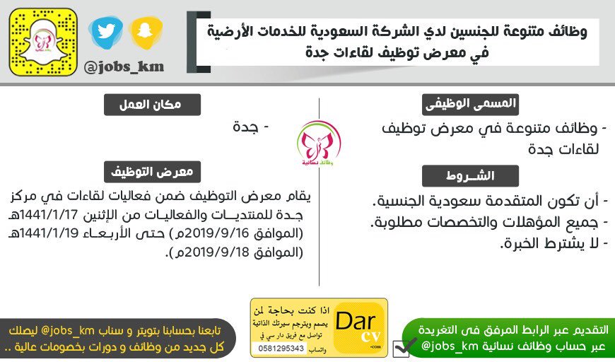 وظائف نسائية On Twitter وظائف جدة شاغرة Jobs Km وظائف متنوعة للجنسين لدي الشركة السعودية للخدمات الأرضية في معرض توظيف لقاءات جدة التفاصيل بالصورة بالأسفل التقديم عبر الرابط اختر الوظيفة وقفة بتعبئة